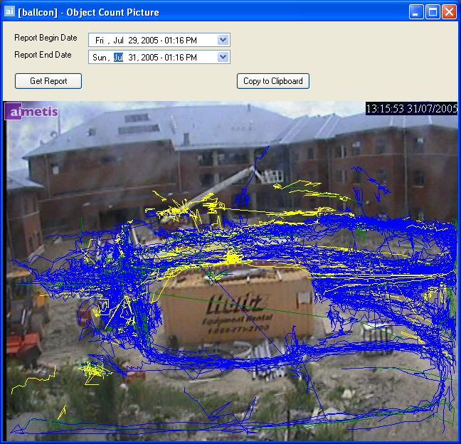 This is a default report which allows users to query the AIRA Server Database and generate a graphical report summarizing object traffic for the currently selected camera. To access the Object Count Picture dialog, click Search > Object Count Picture.