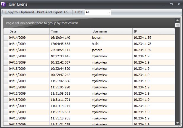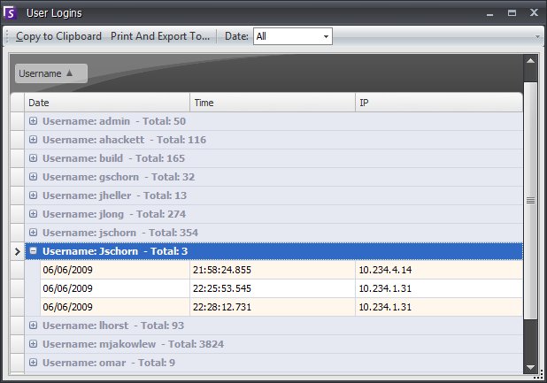 View Logins can be used to see who is accessing a Symphony server. To open the Logins interface, from Symphony Client select Server > View Logins.